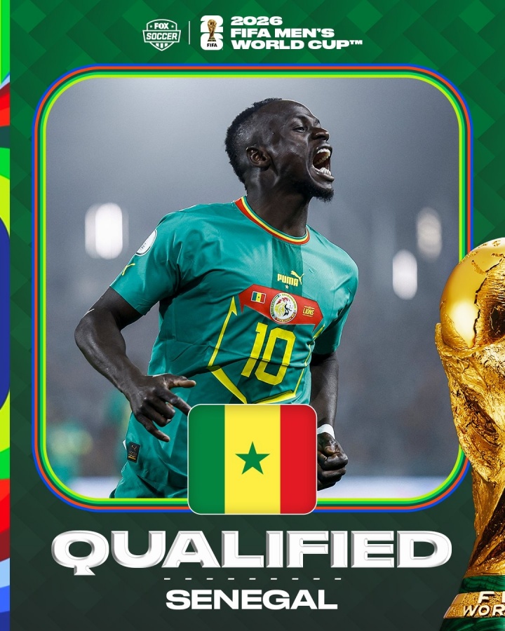 10月15日讯 世预赛非洲区小组赛B组,塞内加尔锁定小组第1,直通2026世界杯!
